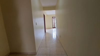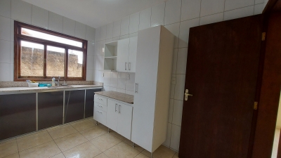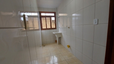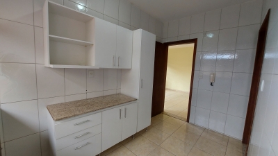 Apartamento com dois quartos, sala conjugada com a copa, cozinha com armários, banheiro social, área de serviços e garagem.