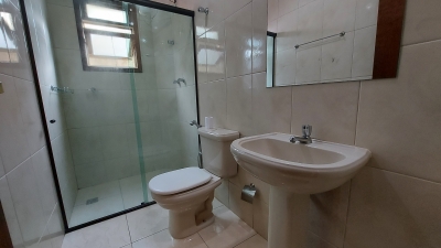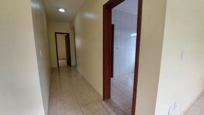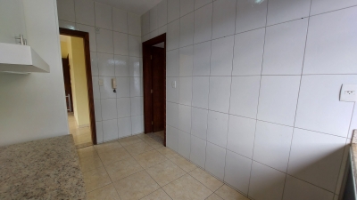 Apartamento com dois quartos, sala conjugada com a copa, cozinha com armários, banheiro social, área de serviços e garagem.