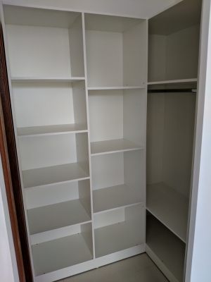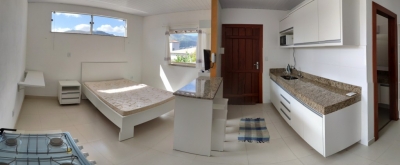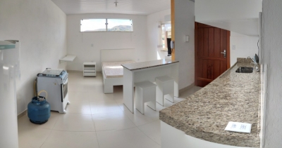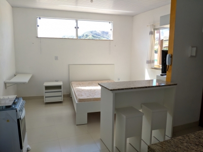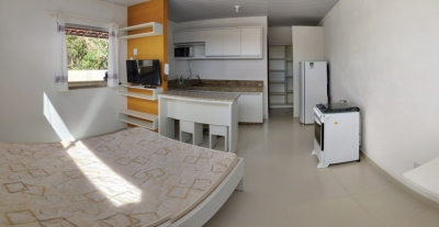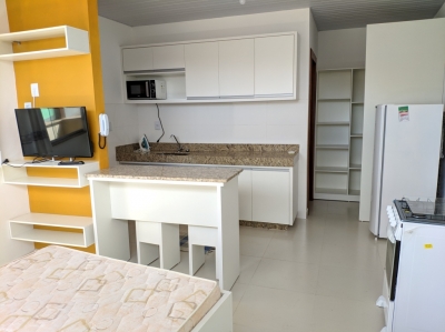 Kitnet semi nova com um quarto, cozinha, banheiro e área. Mobiliada com planejados.